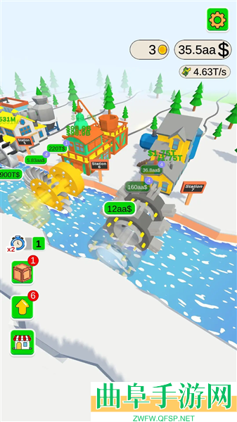 5、到了后期水道的宽度也会不断地扩大,扩大之后要及时添加车轮轴承,玩法就是升级设备、增加水力发电机。