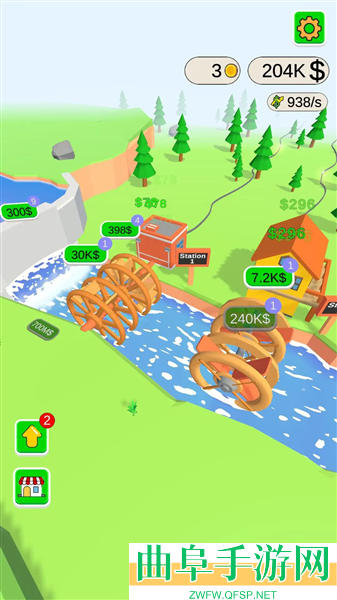 1、打开游戏,首先点击绿色按钮“2”,就能立马建造一个水力发电机。