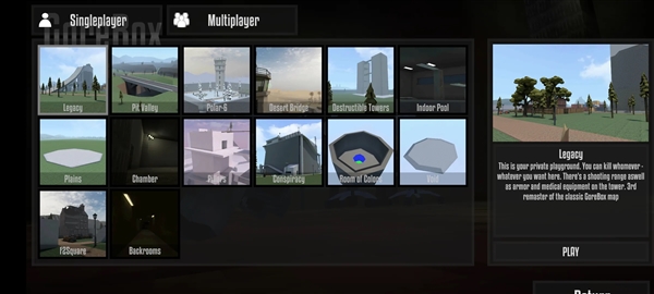 1、进入游戏后,选择“play”按钮,会出现地图,我们可以自己在地图中进行创造,与《我的世界》有些相似,创造自己的战斗世界;